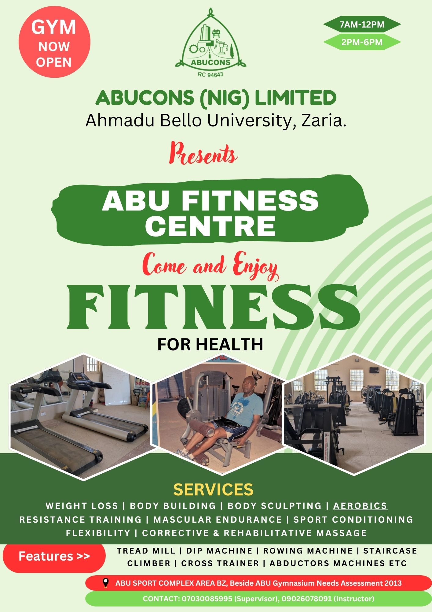 ABUCONS (Nig) Limited Launches Modern Fitness Centre at ABU Zaria ABUCONS (Nig) Limited is proud to announce the official opening of the ABU Fitness Centre located within Ahmadu Bello University, Zaria. This newly established fitness facility is designed to promote healthy living and physical well-being among students, staff, and the wider community. The centre is equipped with modern gym facilities to support a wide range of fitness goals — from weight loss and bodybuilding to endurance training and overall wellness. 🏋️♂️ Key Features: Fully equipped gym with advanced machines Aerobics and fitness training sessions Weight loss and body sculpting programs Personal and group training options ⏰ Opening Hours: Morning: 7:00 AM – 12:00 PM Evening: 2:00 PM – 6:00 PM The ABU Fitness Centre offers a welcoming and motivating environment for individuals at all fitness levels. Whether you're just starting or maintaining your routine, this centre provides the right tools and support. 👉 Come and enjoy fitness for better health! [...]
