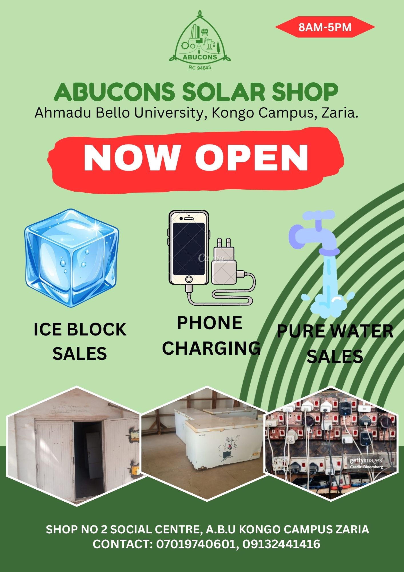 ABUCONS Solar Shop Opens at ABU Kongo Campus, Zaria ABUCONS (Nig) Limited has officially opened its Solar Shop at Ahmadu Bello University, Kongo Campus, Zaria, to provide essential daily services powered by reliable energy solutions. This initiative aims to serve students, staff, and visitors with convenient and affordable services in a clean and accessible environment. ⚡ Services Available: Ice block sales Phone charging services Pure water (sachet water) sales ⏰ Opening Hours: 8:00 AM – 5:00 PM Located at Shop No. 2, Social Centre, ABU Kongo Campus, the Solar Shop ensures uninterrupted services through sustainable solar power. This development reflects ABUCONS’ commitment to innovation, sustainability, and improving everyday campus life. 👉 Visit today and enjoy reliable, solar-powered services! [...]